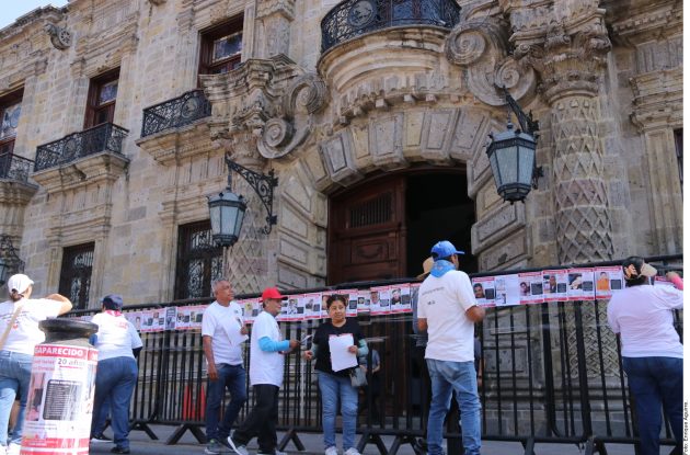 El grupo de familiares llegó y comenzó a colocar lonas con las fichas de búsqueda sobre la explanada frente al Palacio de Gobierno que estaba resguardado con barreras metálicas de seguridad.