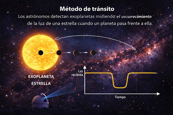 Para hallar exoplanetas (planetas más allá del Sistema Solar que la mayoría de las veces se encuentran a años luz de distancia) los investigadores recurren a dos técnicas: la primera de ellas, llamada método de tránsito, consiste en que un exoplaneta produce un oscurecimiento periódico de la luz de su estrella anfitriona a medida que pasa frente a ella.