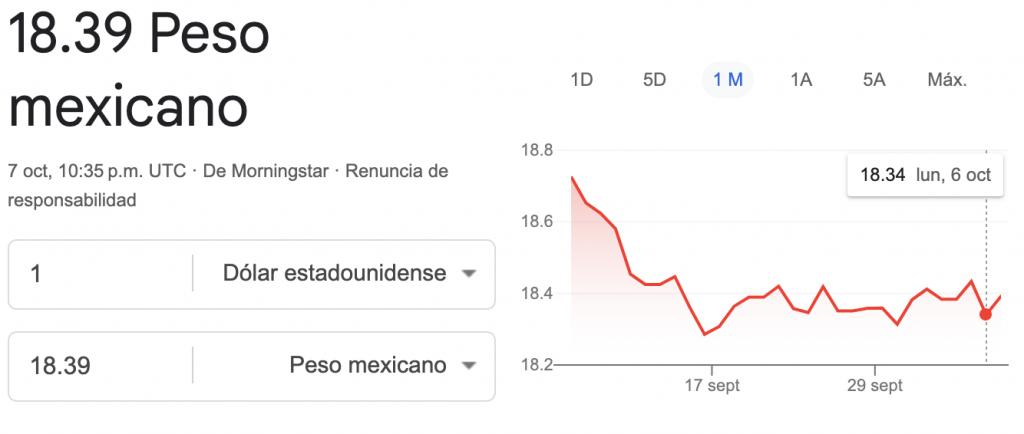 Ciudad de México.- En la última jornada, el dólar estadounidense cerró con un precio promedio de 18.39 pesos mexicanos, lo que representó un aumento del 0.29% respecto al cierre anterior de 18.34 pesos, según datos de Dow Jones.