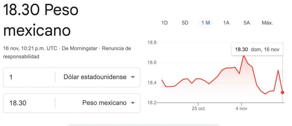 Ciudad de México.- El peso mexicano ha oscilado alrededor de las 18.50 unidades por dólar, moviéndose ligeramente por encima y por debajo de ese nivel. El dólar se cotiza hoy entre 18.3028 y 18.3150 pesos por unidad, el mismo valor con el que cerró el viernes 14 de noviembre en el mercado interbancario.
