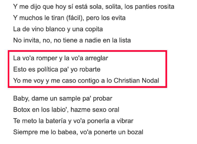 El fragmento de ‘Rosita’ que no pasó desapercibido para nadie fue la parte que dice: “La vo’a romper y la vo’a arreglar. Esto es política pa’ yo robarte. Yo me voy y me caso contigo a lo Christian Nodal”. La canción hace referencia a la rapidez y la intensidad con la que el cantante mexicano ha manejado sus relaciones y compromisos públicos.