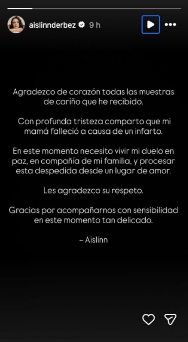 Por su parte Tania Rincón también habló al respecto y recordó que la actriz pidió a sus seguidores respeto y empatía por el momento que está atravesando, tras el fallecimiento de su madre: “Aislinn a través de sus historias, pidió que quería vivir este momento de duelo en paz y desde el amor, para obviamente honrar la vida de su madre” dijo Tania Rincón