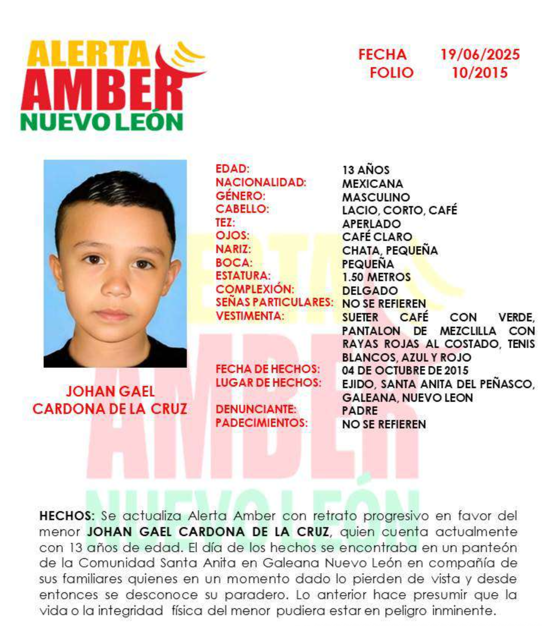 Saltillo, Coah.- A casi diez años de la desaparición del pequeño Johan Gael Cardona de la Cruz en la sierra de Galeana, personal de la Fiscalía de Nuevo León reactivó su búsqueda por medio de una Alerta Ámber en la que se presenta una fotografía con una progresión del rostro del menor hecha con inteligencia artificial.