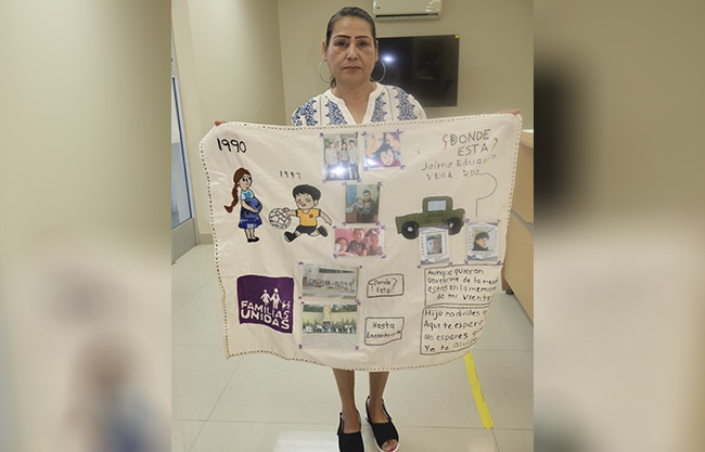 “ De mi hijo fue en trayecto, él aquí trabajaba, se casó con una muchacha de Nuevo Laredo y se fueron a visitar a su papá allá, una semana o quince días, me avisan que no lo encuentran, que no ha regresado a la casa, de mi nieto él estudia, tiene 20 años, estudia pedagogía en la Universidad Autónoma de Tamaulipas, él desaparece en la escuela”, comparte.