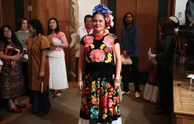 “ Esa curiosidad la llevó de Oaxaca a Guatemala y luego a Los Ángeles, donde impartió talleres de zapoteco. Sus huipiles, enaguas y proyectos que combinan texto y bordado hacen tangible la poesía.