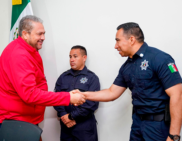 Acompañado por el secretario del Ayuntamiento, Alejandro González Farías; y el director de Seguridad Pública Municipal, Rolando Álvarez Flores, el alcalde Tomás Gutiérrez Merino, distinguió a dos elementos por su desempeño, compromiso y resultados en favor de la ciudadanía.