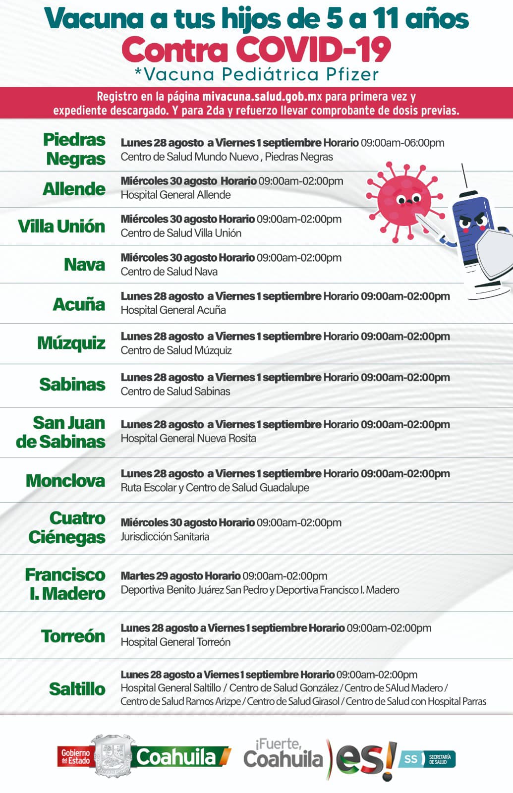 Las dosis pediátricas serán distribuidas en el Hospital General de Saltillo y en los centros de Salud González y el Madero, y se aplicarán del 28 de agosto al 1 de septiembre en horario de 9 de la mañana a 2 de la tarde.