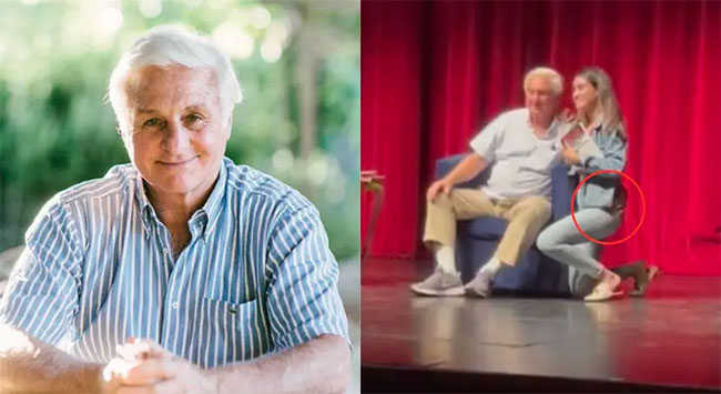 En el video, se observa a Canessa sentado en el sillón en el que estuvo durante la conferencia, ahí se acercó la joven para saludarlo de beso, pero esto lo hace agachada, pues el sobreviviente no se levantó.