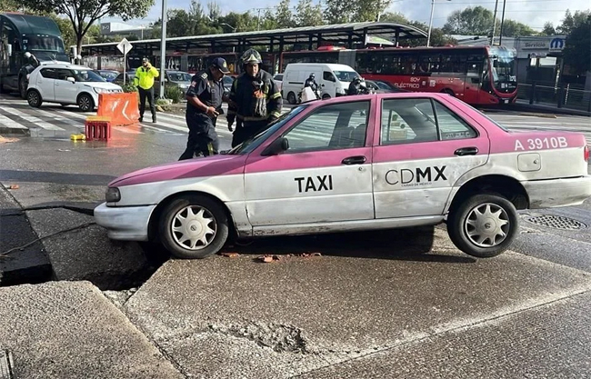 Debido a la oquedad, un taxi quedó atrapado. Bomberos de la CDMX acudieron al lugar para realizar su retiro.