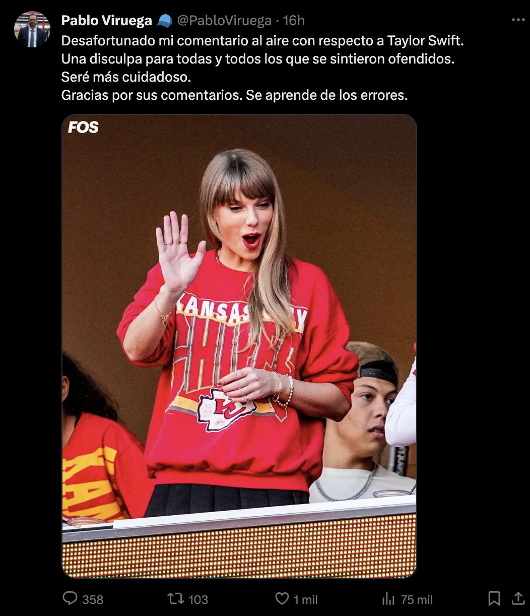 “Se aprende de los errores’: Pablo Viruega realiza comentario machista contra Taylor Swift.