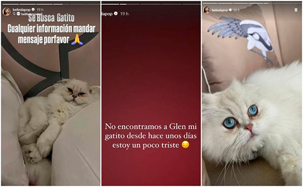 Ciudad de México.- La cantante Belinda lanzó un mensaje para pedir ayuda porque su gato llamado Glen está perdido, la cantante, amante de estos animales, confesó que se encuentra un poco triste por esta situación.