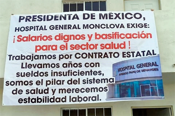 “ Hospital General de Monclova exige, ¡salarios dignos y basificación para el sector salud! Trabajamos con contrato estatal, llevamos años con sueldos insuficientes, somos el pilar del sistema de salud y merecemos estabilidad laboral”, se leía en la lona.