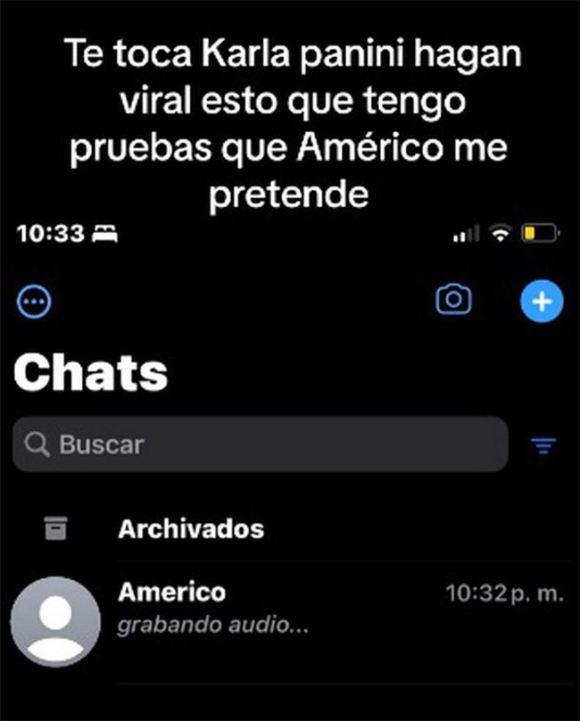 En TikTok, la usuaria Estefany Mendoza (@estefanymendozzaa) compartió una publicación donde mostró que supuestamente Américo estaba grabándole un mensaje de voz. Y añadió el siguiente texto: “Te toca Karla Panini. Hagan viral esto que tengo pruebas que Américo me pretende”.
