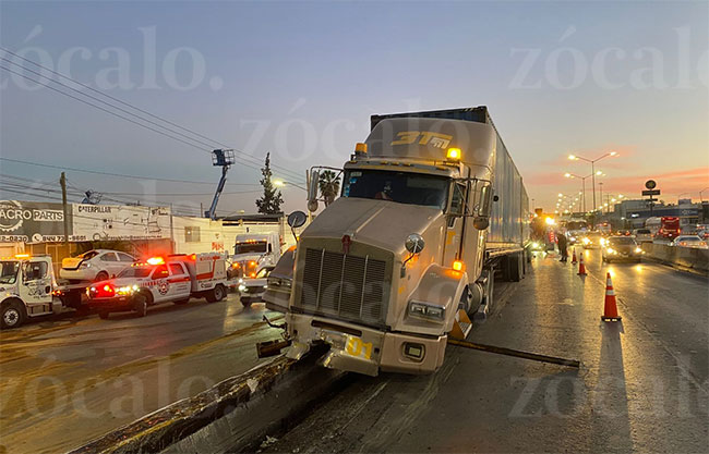 Lo anterior, aunado al exceso de velocidad con la que se desplazaba, ocasionó que el tráiler subiera al camellón lateral y avanzara hasta quedar atorado en el muro de contención del paso elevado, dejando daños de consideración.