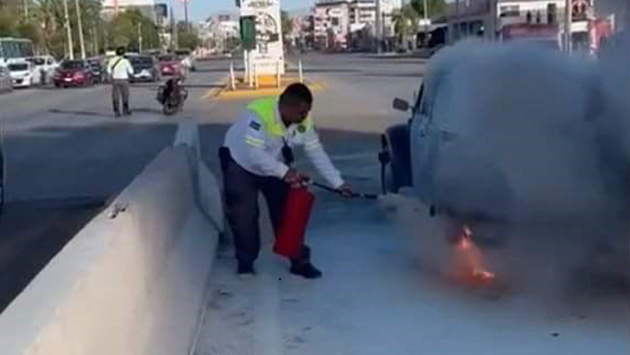 Alfonso Gómez Zarzosa, quien arriesgó su integridad física para combatir el incendio, mencionó que estaban realizando un rondín de prevención y vigilancia, cuando notaron el siniestro en el cruce mencionado, descendió de la unidad y utilizando el extintor disponible en la patrulla de tránsito, procedió a realizar las maniobras necesarias para controlar el incendio.