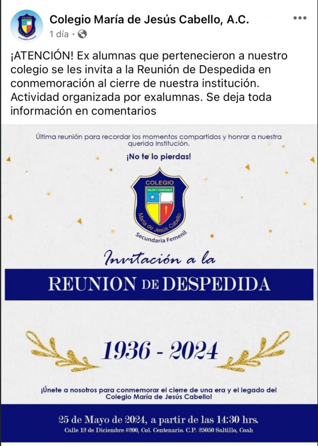 Por este motivo, exalumnas de la institución fundada en 1936 están convocando el próximo sábado 25 de mayo a una reunión de despedida para conmemorar el legado educativo del plantel que actualmente tiene sus instalaciones en la calle 19 de diciembre de la colonia Centrenario.