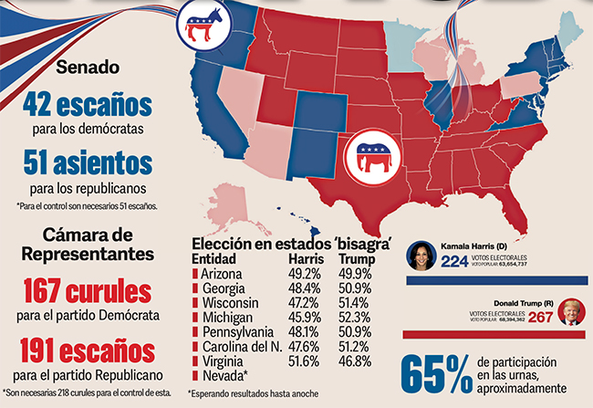 Incluso, la batalla en los llamados “estados bisagra” comenzaba, al cierre de esta edición, a inclinarse en favor de Trump, con victorias en Georgia y Carolina del Norte.