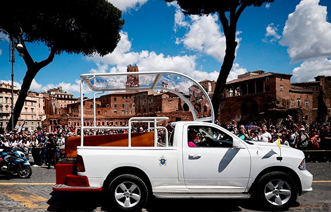 De acuerdo con la periodista Valentina Alazraki, el papamóvil que México obsequió a la Santa Sede y que hoy, sábado 26 de abril 2025 trasladó el cuerpo del Papa Francisco a su última morada terrenal; la Basílica de Santa María es un modelo Dodge Ram 1500 ‘classic’ construido hasta 2024 en Michigan y en Saltillo, Coahuila, Mexico.