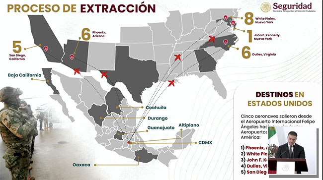 Apuntó que los reos fueron trasladados en 11 aeronaves de la Defensa y una más de la Marina hacia diferentes puntos de EU: