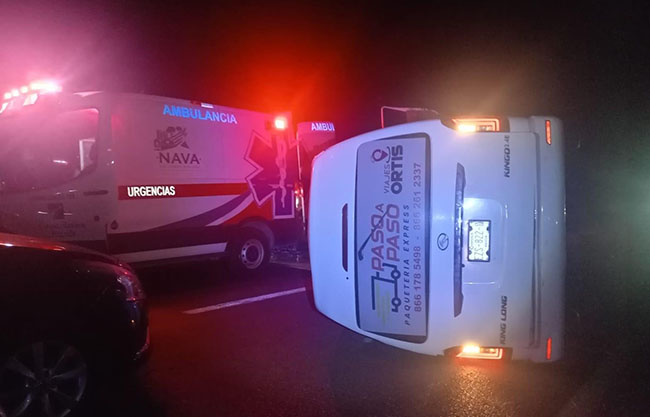 Piedras Negras, Coahuila.- Una movilización de cuerpos de emergencia se registró durante la madrugada de este sábado en la carretera federal 57, en el tramo que conecta Piedras Negras con Nava, luego de que una camioneta de paquetería volcara, dejando como saldo dos personas lesionadas, quienes fueron trasladadas de urgencia a un hospital.