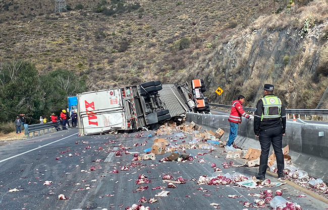 Elementos de la Guardia Nacional tomaron conocimiento de lo ocurrido y realizaron maniobras de abanderamiento, mientras se lleva a cabo el levantamiento del tráiler y la limpieza de la carpeta asfáltica.