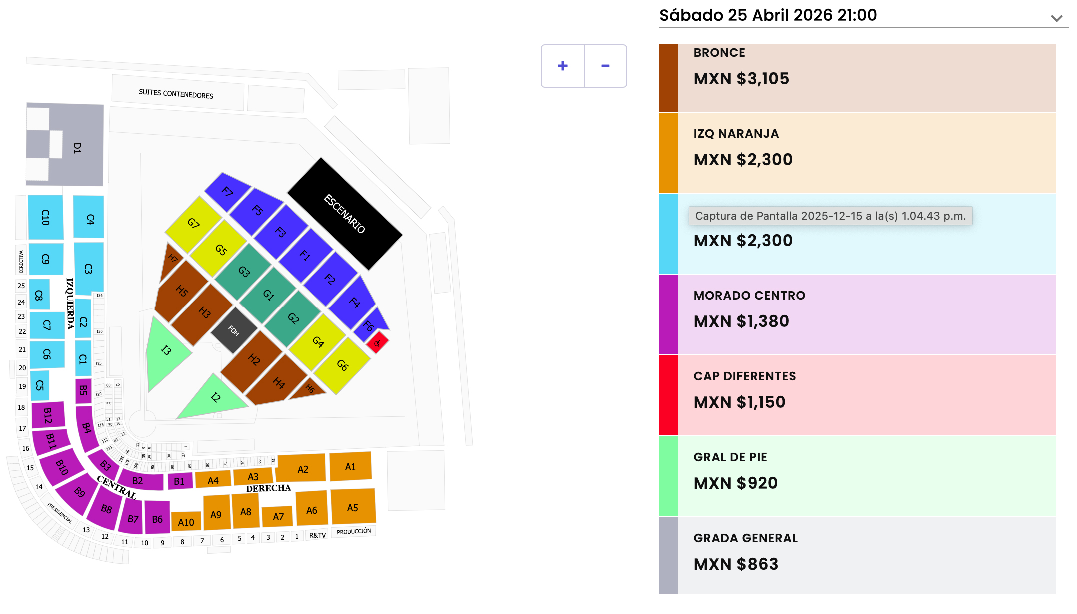 La promotora dio a conocer desde temprana hora el mapa oficial de zonas y precios, permitiendo a los seguidores del cantante conocer con anticipación las distintas opciones disponibles para asistir al concierto. La venta se realiza a través del sistema Superboletos y en los puntos autorizados.